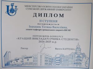 Викладачі кафедри громадського здоров’я навчально-наукового медичного інституту Сумського державного університету здобули відзнаки у щорічних університетських конкурсах, підтвердивши високий рівень професійної та педагогічної майстерності.