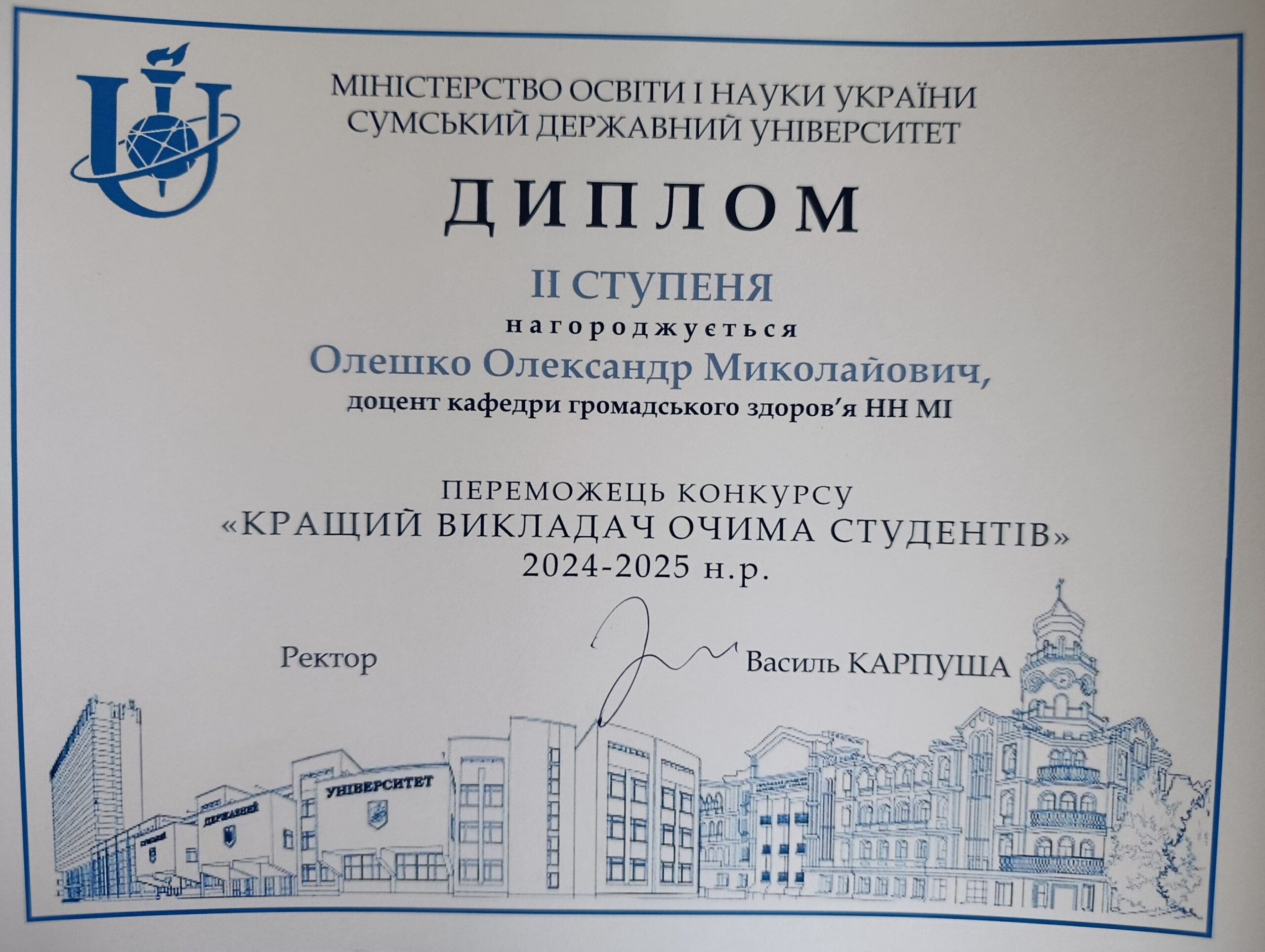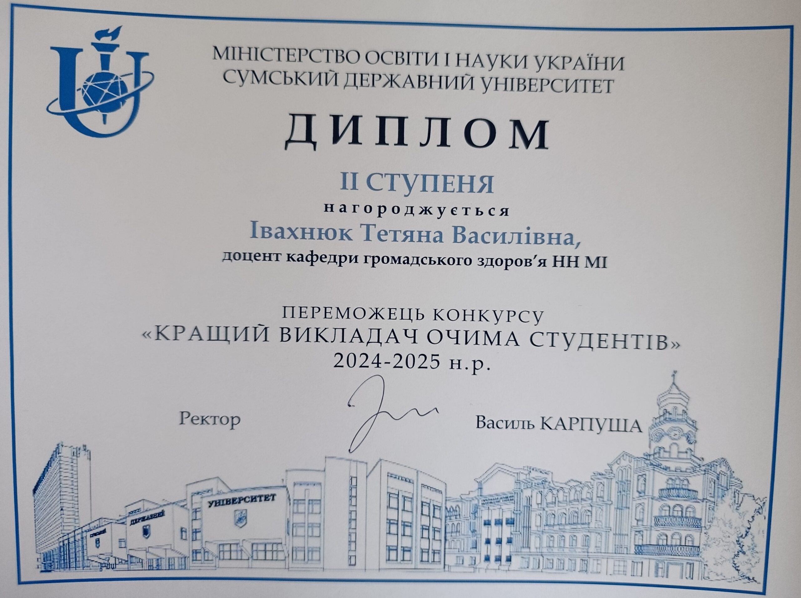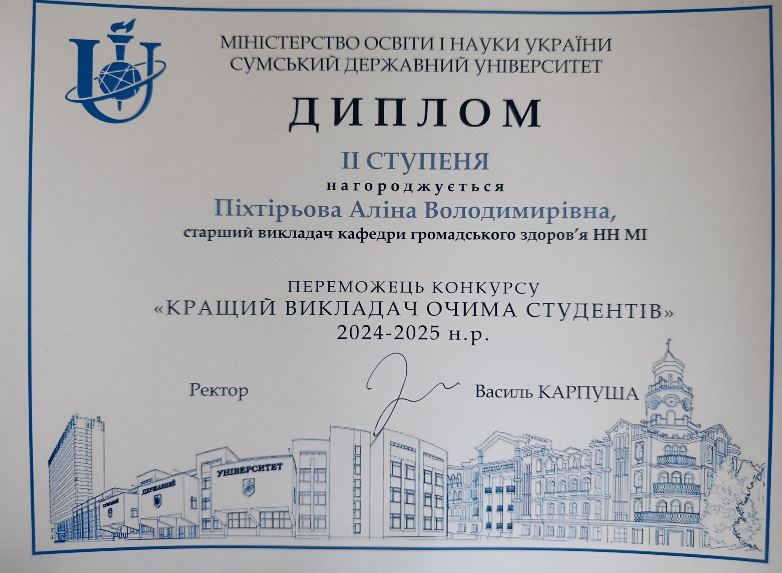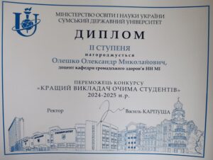 Також Вікторію Голубничу, доцента кафедри громадського здоров’я, відзначено дипломом ІІІ ступеня на рівні інститутів/факультетів у конкурсі «Кращі науково-педагогічні працівники СумДУ» 2025 року.