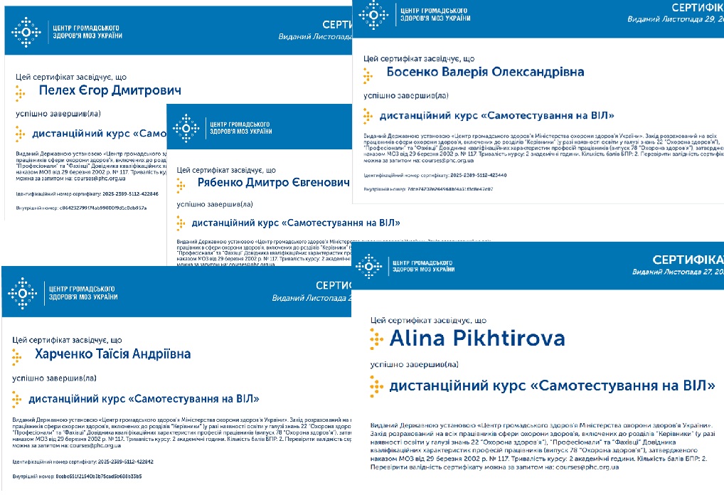 У межах заходів здобувачі освітніх програм «Громадське здоров’я», «Медицина» та «Стоматологія» пройшли онлайн-курс із тематики ВІЛ на національній навчальній платформі Центру громадського здоров’я. Навчальний модуль охоплював питання профілактики, лікування, тестування, подолання стигми та сучасних доказових підходів до реагування на епідемію ВІЛ.